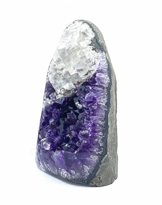 Cut base d'améthyste fusionnée à la calcite blanche cubique