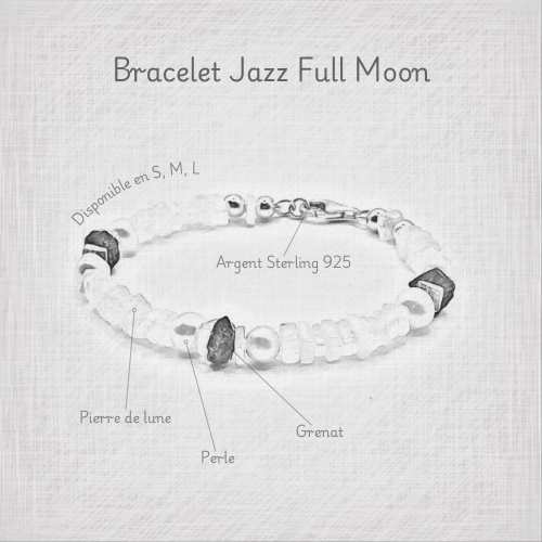 - Bracelet en Pierre de lune, Grenat et Perles rondes d'eau douce blanches.