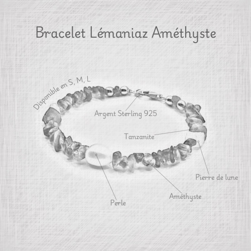 - Bracelet en Améthyste, Pierre de lune, Tanzanite et Perle ovale d'eau douce blanche.